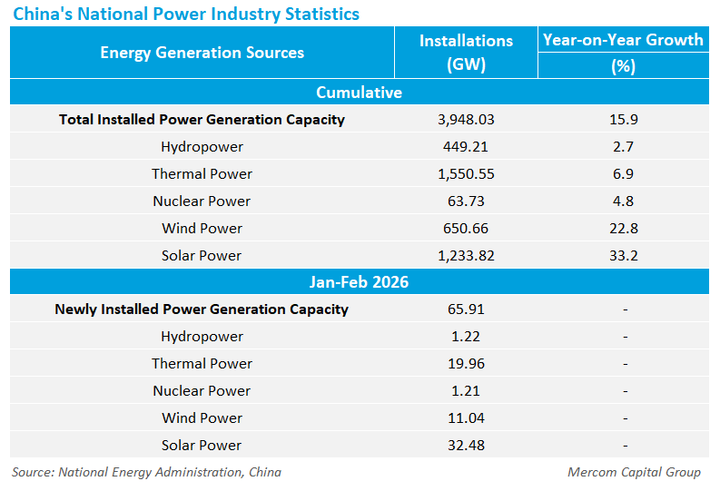 China’s total installed solar generation capacity reached 1,234 GW by the end of February 2026, and wind generation capacity reached 650 GW, increasing 33.2% and 22.8% year-over-year (YoY), respectively, according to the country’s National Energy Administration (NEA).